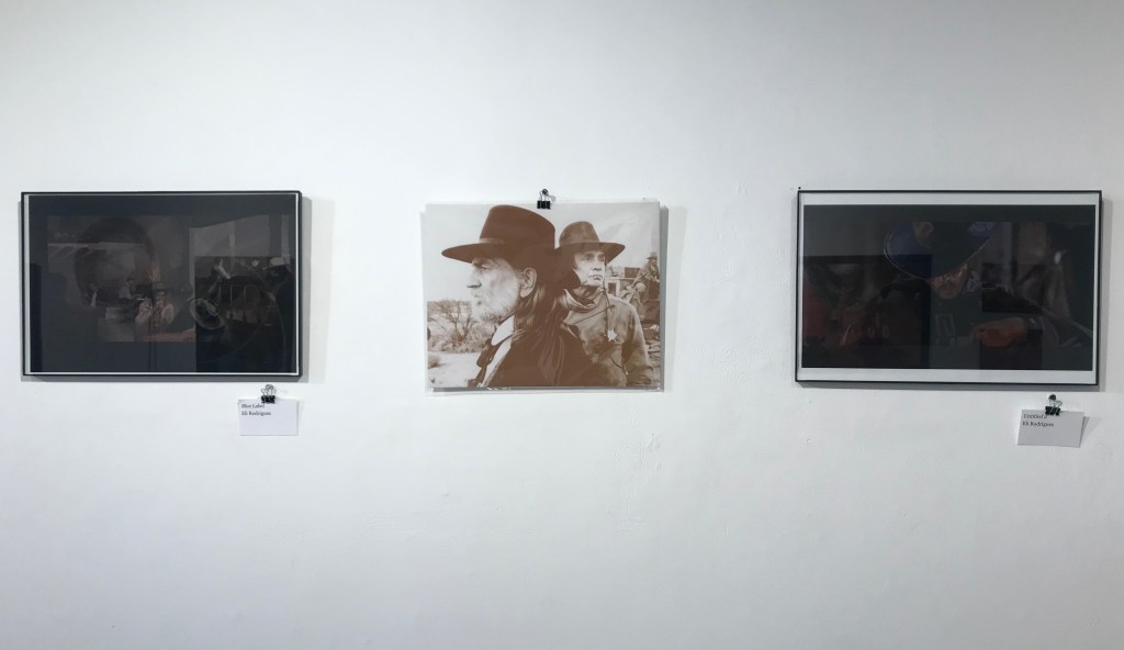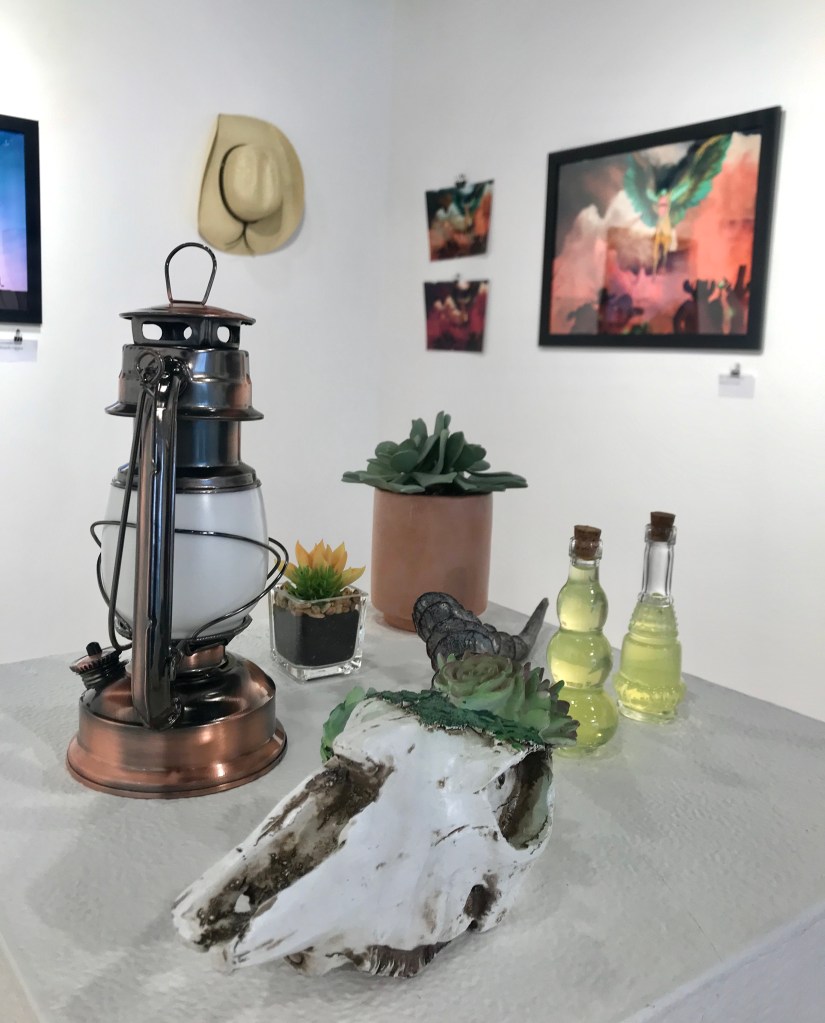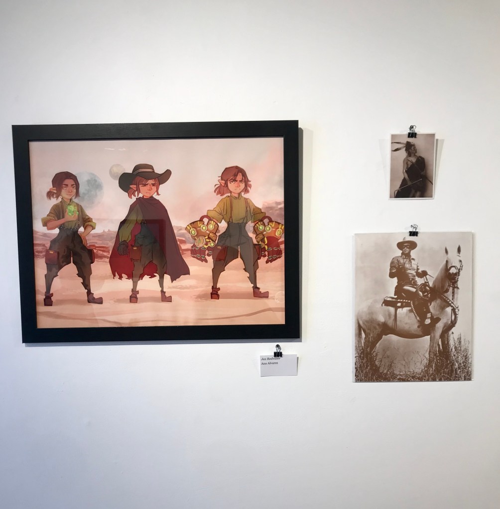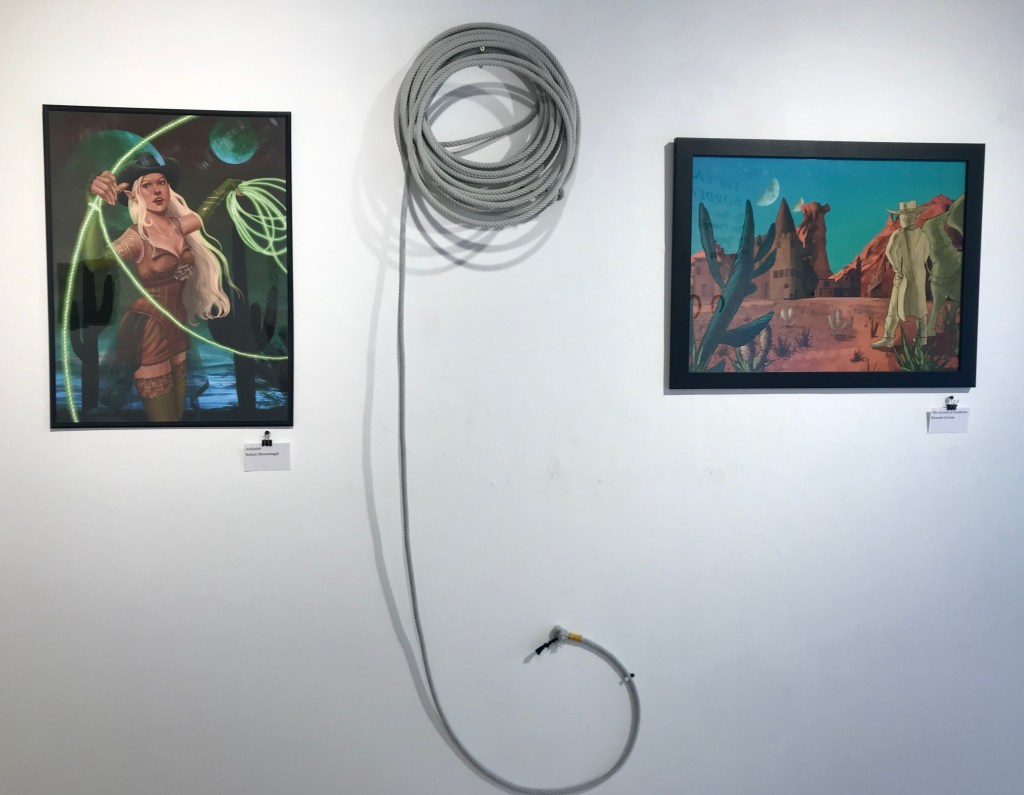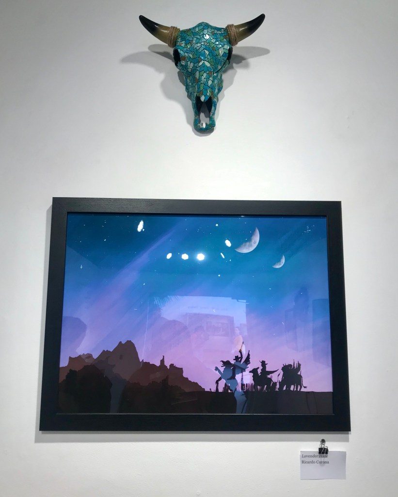 Corona had two pieces in the group exhibit. For one the pieces he used a cool color palette. It was a mixture of blues, purple, black and white. Many colors were overlapping and blended between one another. All of his work was done by digital illustration although it looked like it could have been painted. The white splatter looked as if it could have only came from paint. There was a recurring theme of the wild west and fantasy throughout all of the work. There was a rugged look in the room which the western decorations.
